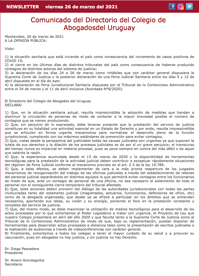 Comunicado del Directorio del Colegio de Abogados del Uruguay